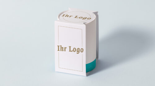 Eine individuelle Papierbanderole, bedruckt (z. B. 4/0 Digitaldruck), umhüllt das Produkt wie ein Umschlag. Hier kannst du Logo und Botschaft wirkungsvoll platzieren.