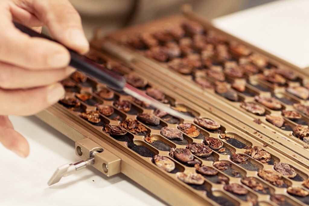 Nach der Anlieferung werden die Bohnen optisch und sensorisch geprüft – etwa auf Feinheit, Aroma und Farbe. Anschliessend erfolgt eine schonende Röstung, damit sich ihre feinen Nuancen entfalten können. In der Conche wird die Schokolade mit Zeit und Erfahrung bewegt, bis sie ihre charakteristische Textur und das volle Aromaprofil erreicht.