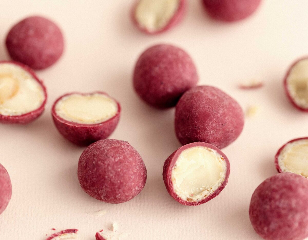 Macadamianüsse 34%, Zucker, Kakaobutter, Himbeerpulver 4,6%, Mandeln, Reissiruppulver, Glucosesirup, Kokosraspel, Meersalz, Hibiskuspulver 3.6%, Emulgator (E322), Vanillepulver, Vanilleextrakt.